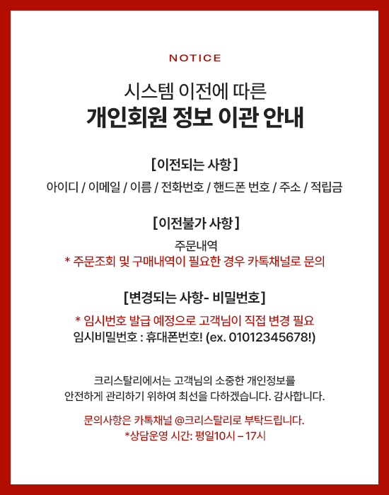 저희 크리스탈리를 믿고 이용해주시는 고객님들께 보다 나은 서비스를 제공하고자 시스템 이전을 결정하게 되었습니다.
